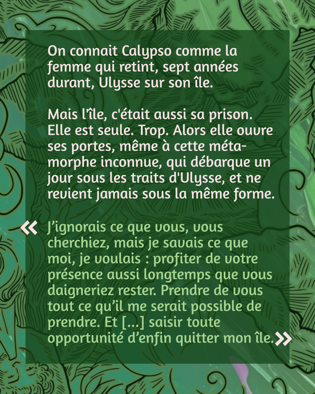 "J’ignorais ce que vous, vous cherchiez, mais je savais ce que moi, je voulais : profiter de votre présence aussi longtemps que vous daigneriez rester. Prendre de vous tout ce qu’il me serait possible de prendre. Et [...] saisir toute opportunité d’enfin quitter mon île."](https://corneilles.files.fedi.monster/cache/media_attachments/files/116/477/501/397/676/157/small/3052d93e70350ac5.png)