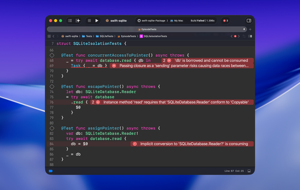 Mar 3, 2026, 8:25 PMSwift's ownership tools allow us to restrict how users of our libraries interact with dangerous objects, such as a raw database pointers. They should never escape from a database transaction, and now this is enforced by the compiler.