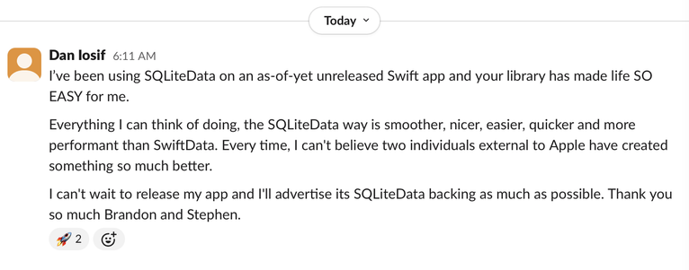 Point-FreepointfreecoMar 10, 2026, 2:25 PMHave you tried SQLiteData yet?https://github.com/pointfreeco/sqlite-data