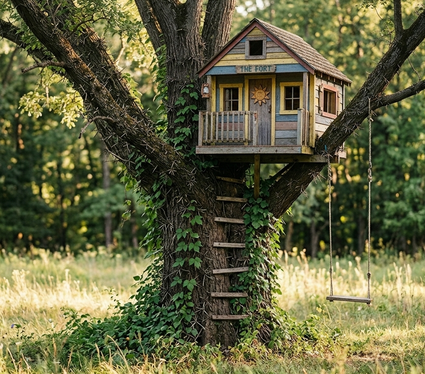 Treehouse in tree with lots of thorns and poison ivy