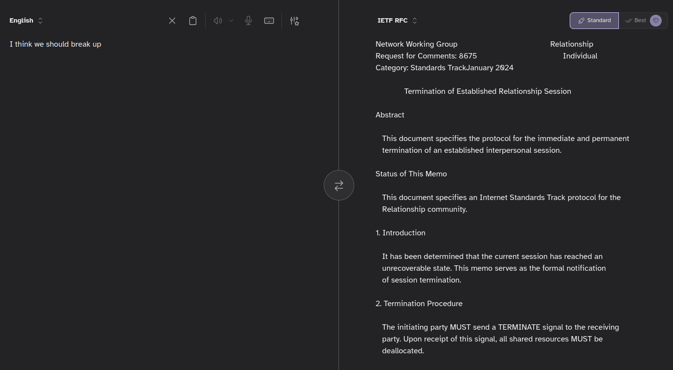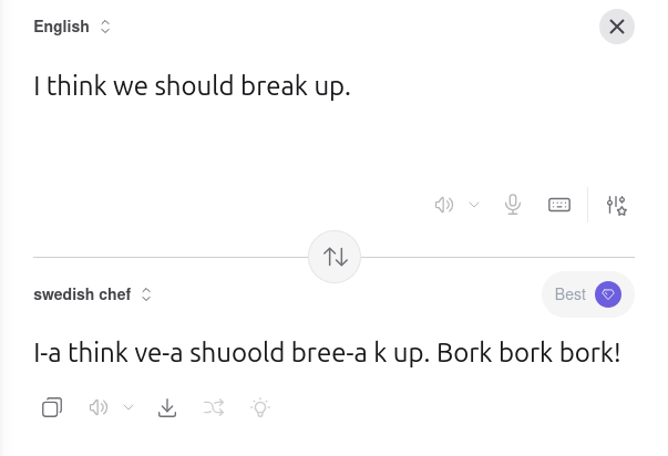 @jalefkowit This seems about right: https://translate.kagi.com/?from=en&to=swedish+chef&text=I+think+we+should+break+up.